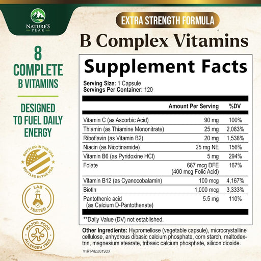 Nature's Peak3X STRENGTH SUPER B COMPLEX (1000mcg): Super B-vitamin formula designed to fuel daily energy for both women and men ENERGY & FOCUS SUPPORT: Co...