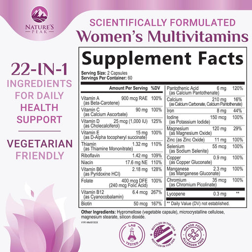 View full detailsMultivitamin for Women - Complete Daily Womens Multivitamins with Calcium, Folate, Vitamin A, C, D, E & B Vitamins, Zinc and Iron - Multi Vitamins for Bone, Energy & Immune Support - 60 Capsules