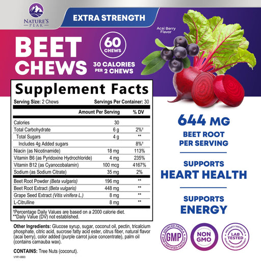 Beet Chews - Soft Beet Root Chewables with Grape Seed Extract Supports Heart Health & Energy with Powerful Antioxidants - Beetroot Nitric Oxide Supplement, Acai Berry Flavor - 60 Vegan Soft Chews