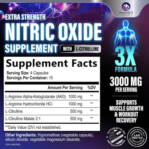 Nature's PeakPowerful Nitric Oxide Support: Packed with 3000mg of L-Arginine and Citrulline Malate, this supplement has nitric oxide production to support flow...